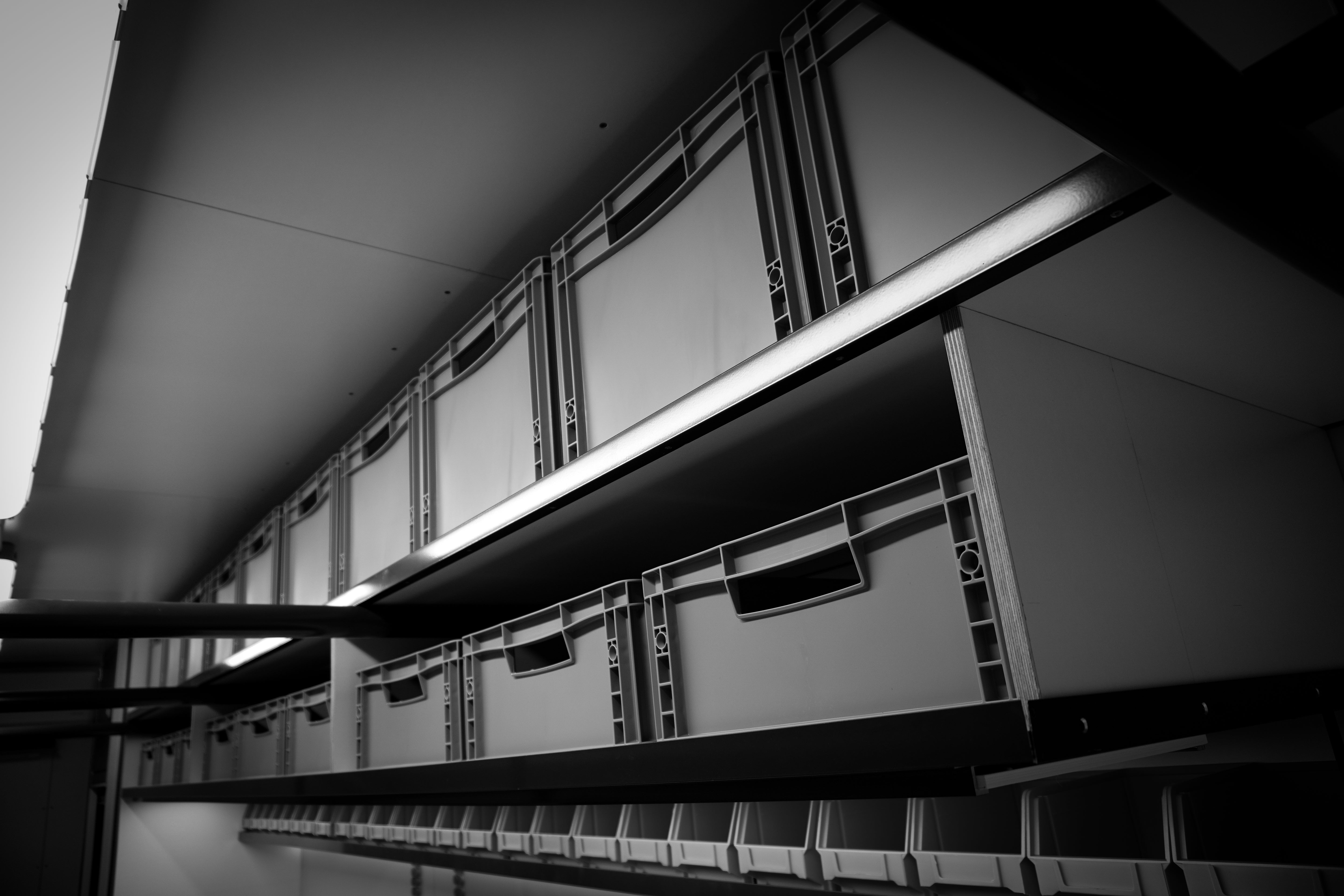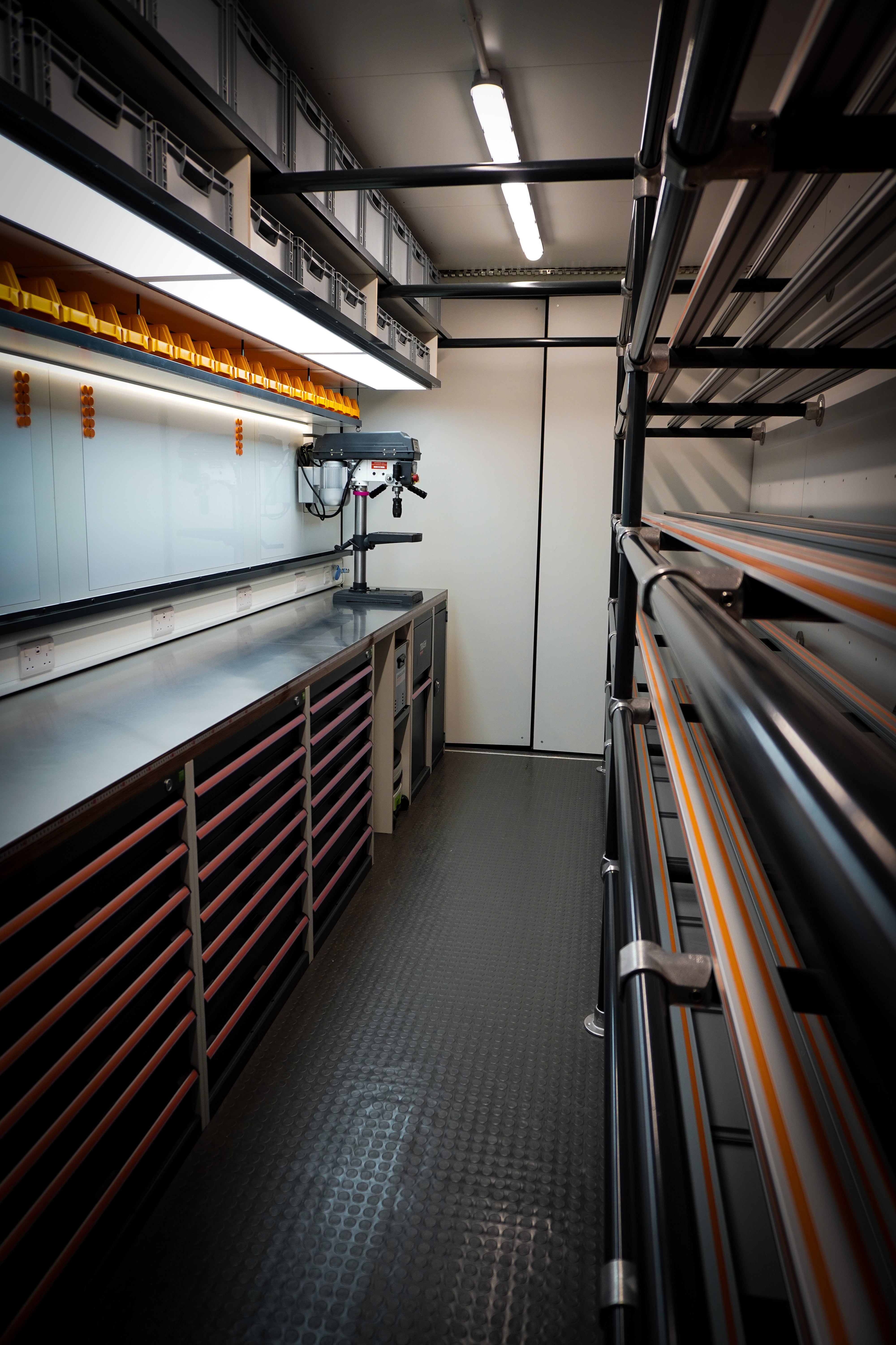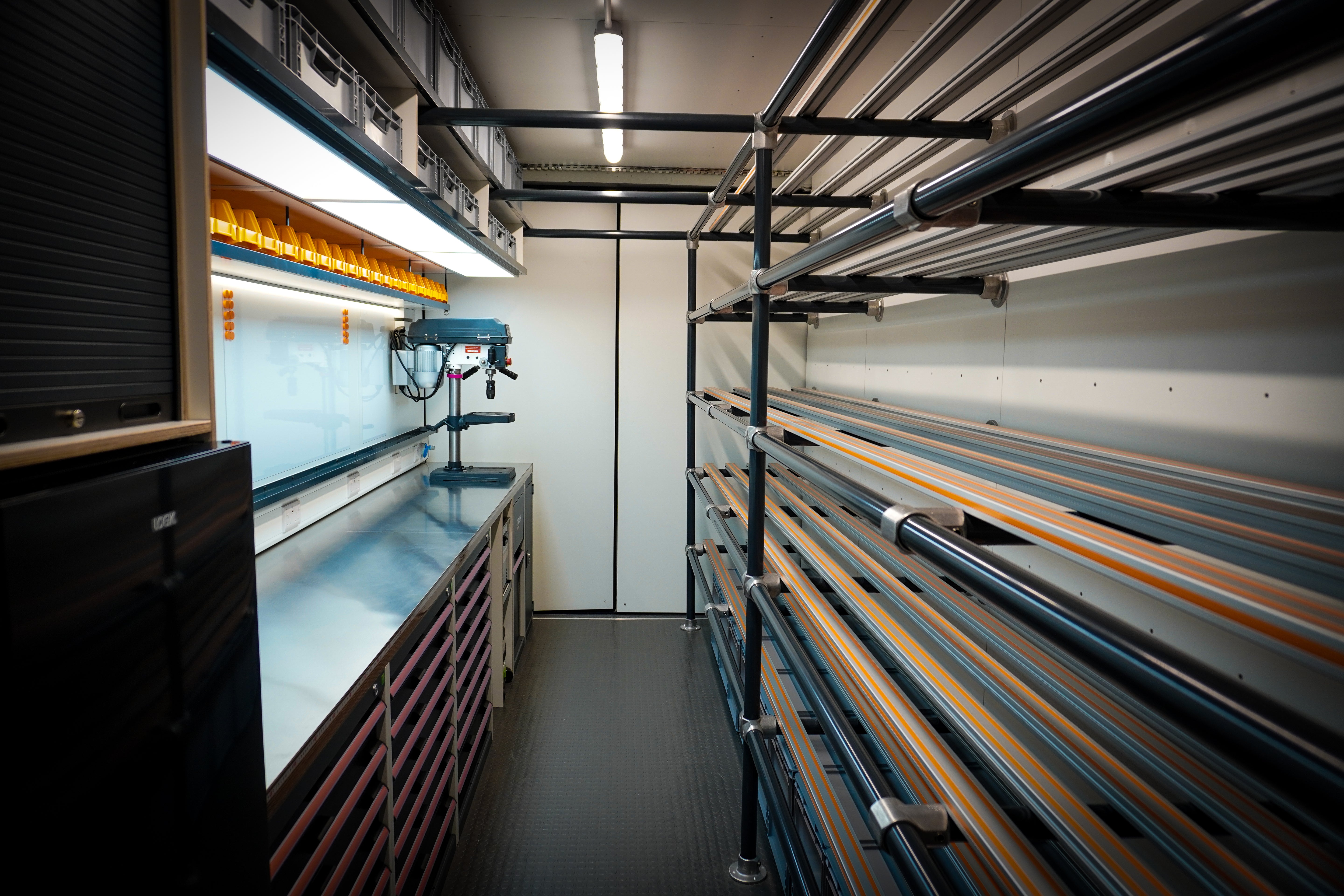 Integrated Bott units - custom fitted to requirements with tool inlays and hidden storage solutions for sanitary purpose.
