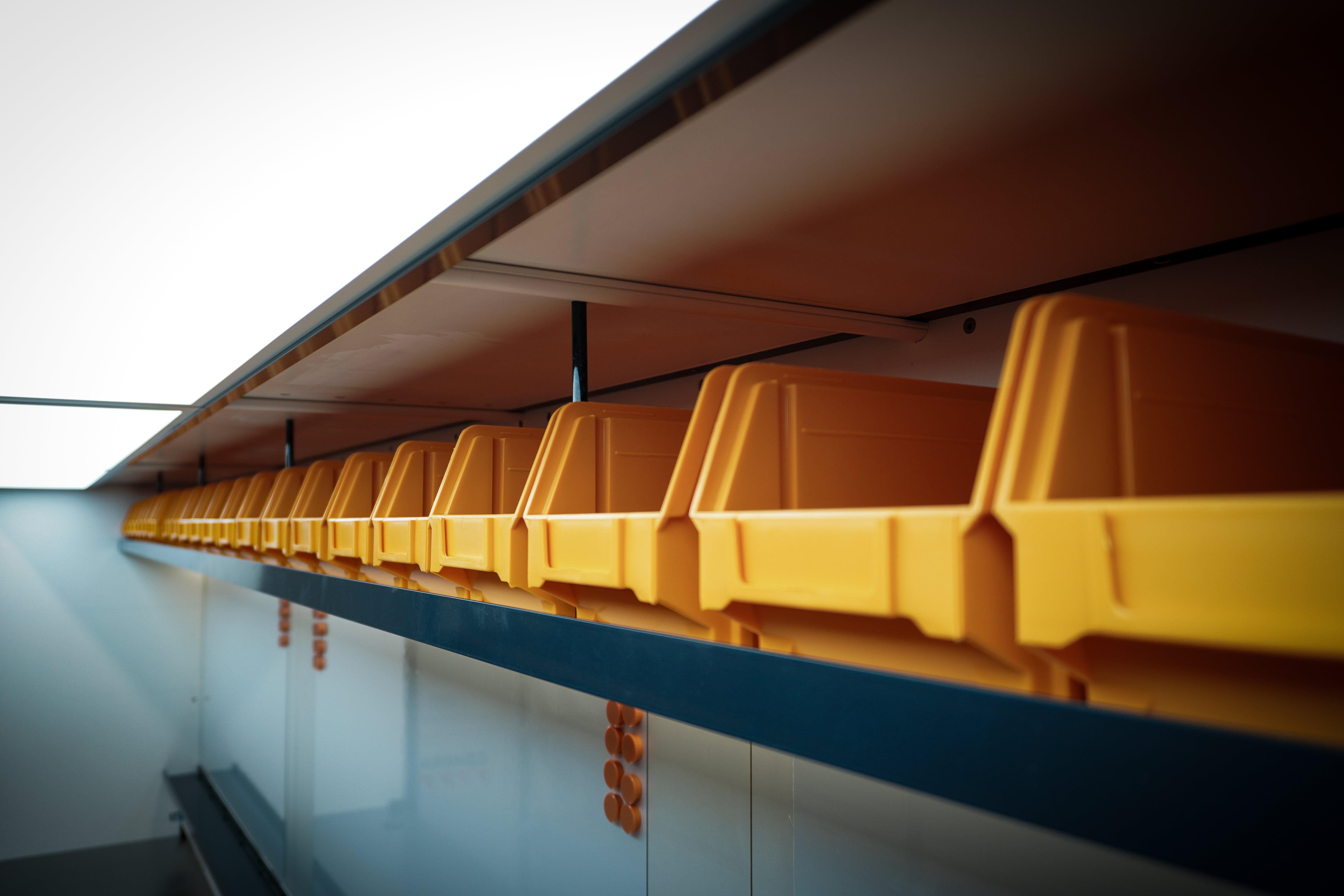 Tailored Aluminium storage racking - powder coated supports, lightweight, tough. Colour coded infills on request.