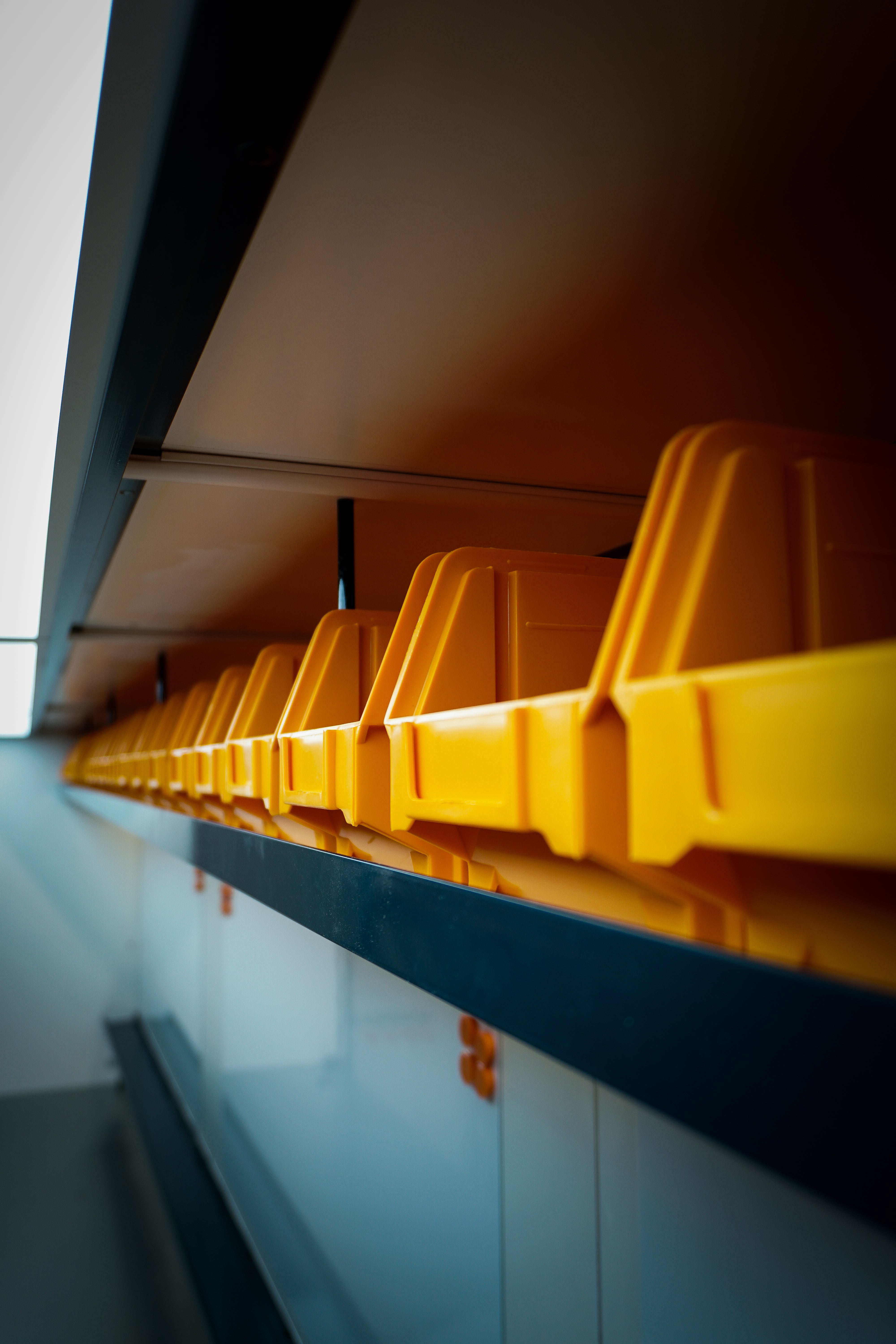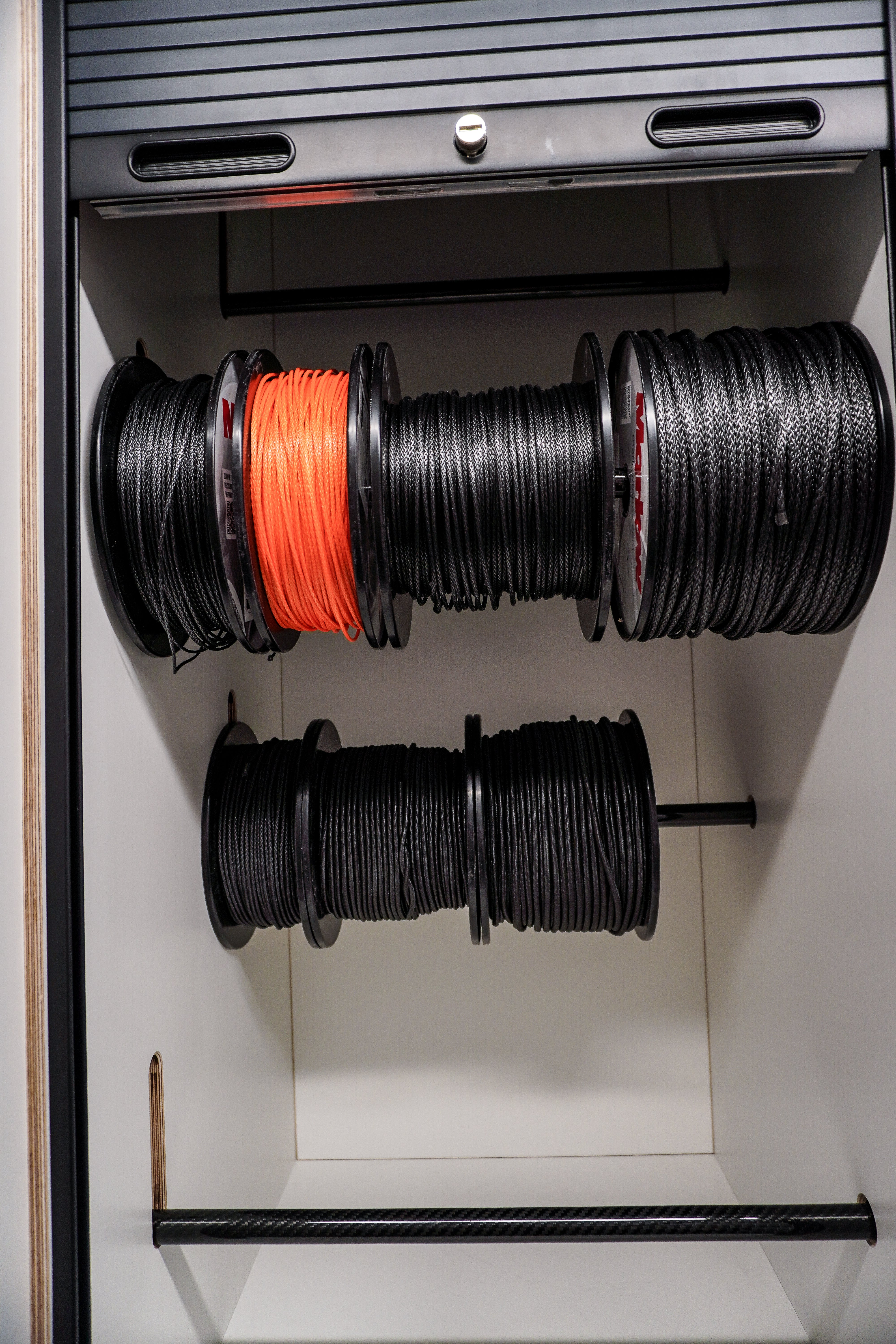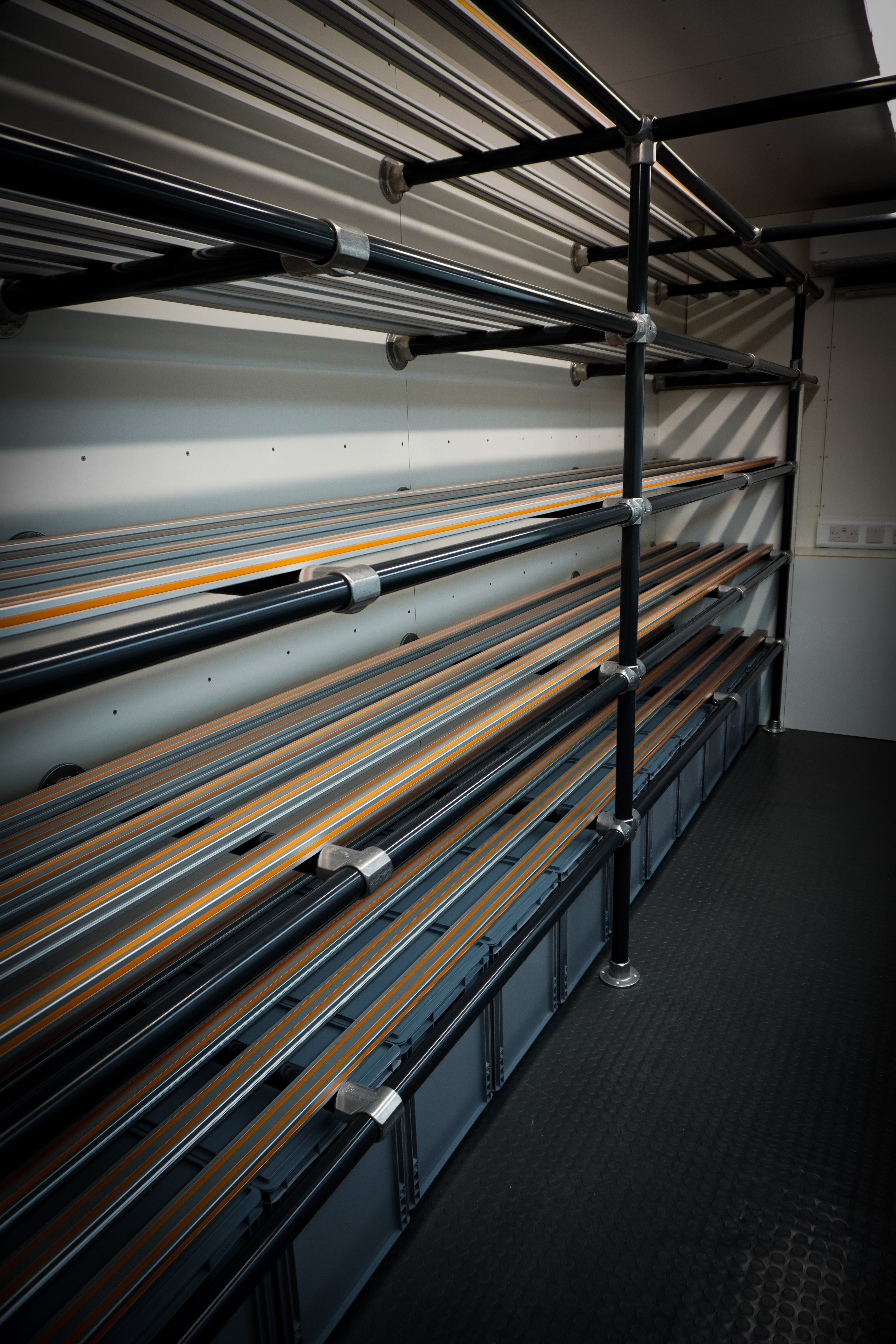 Fabricated Storage racking. Designed to be multi-function from euro crates to sail storage. Built and colour coded to specification.
